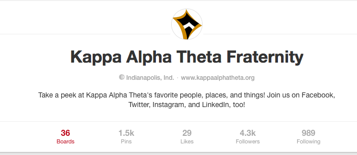 While Facebook has the most followers, Pinterest does a great job of advertising Kappa Alpha Theta’s other social media platforms. Below is the Pinterest cover page for Kappa Alpha Theta Fraternity, encouraging follows on Facebook, Twitter, Instagram and LinkedIn.