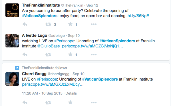 Based on this thread, The Franklin Institute even used Periscope to broadcast behind the scenes footage of the arrival of artifacts from the Vatican. Did anyone watch? I’m not sure. On their LinkedIn page, there is actually has a posting for a marketing manager. They are aware that their social media platforms could use more engagement and plan to give these newest tools in their integrated marketing communications campaign more attention.