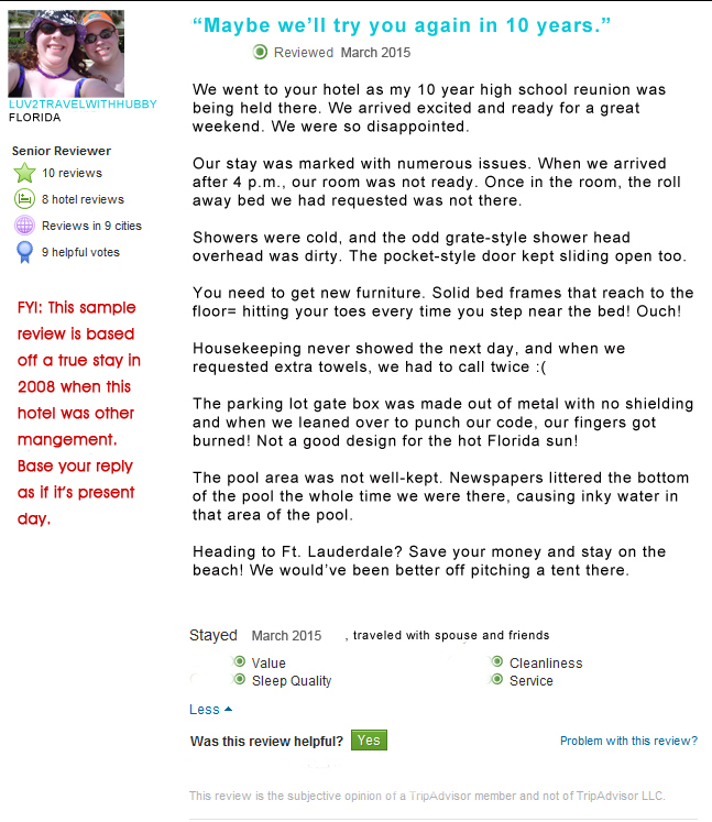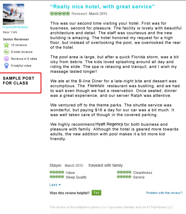 For academic purposes, I will be responding to two TripAdvisor posts, selected by my professor, one overall positive, the other not so much.