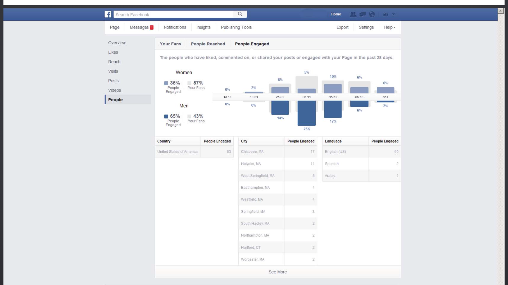 Men ages 35-44 are most engaged with their Facebook site. This could be the demographic that is targeted to increase organic participation as opposed to paid advertisement. Narrowing down content to a target market will be more efficient for these busy entrepreneurs.